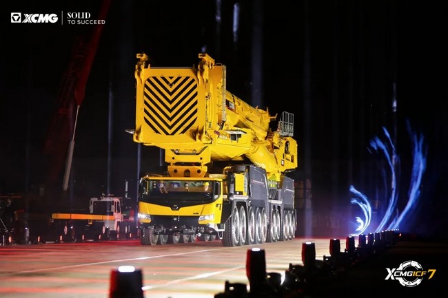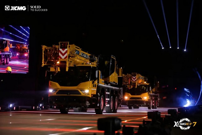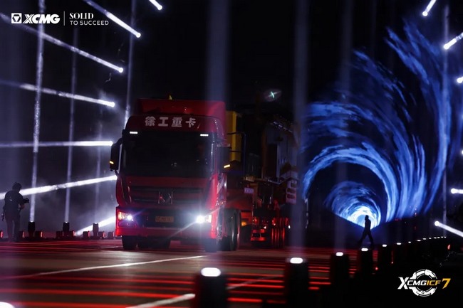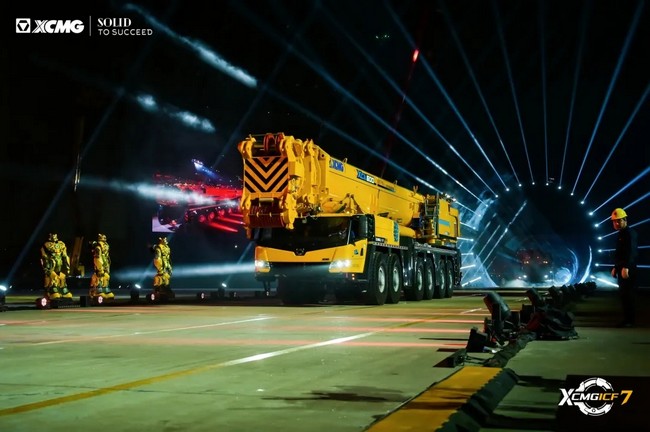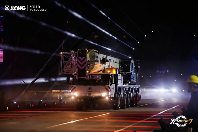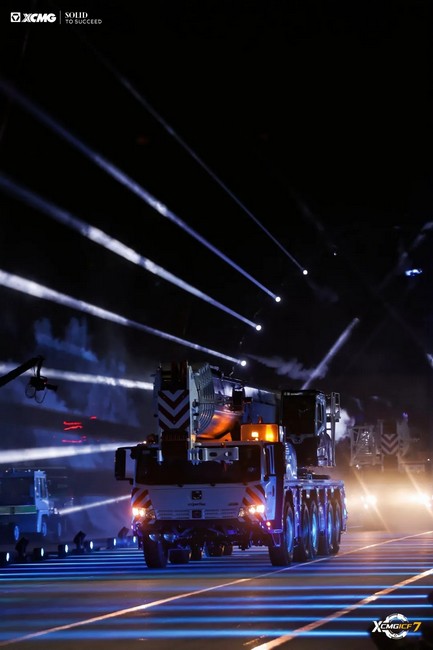 引擎轰鸣中,16台jbo竞博起重机启程,驶向全球,灯光在夜幕中汇成“时光隧道”,照亮远征之路。