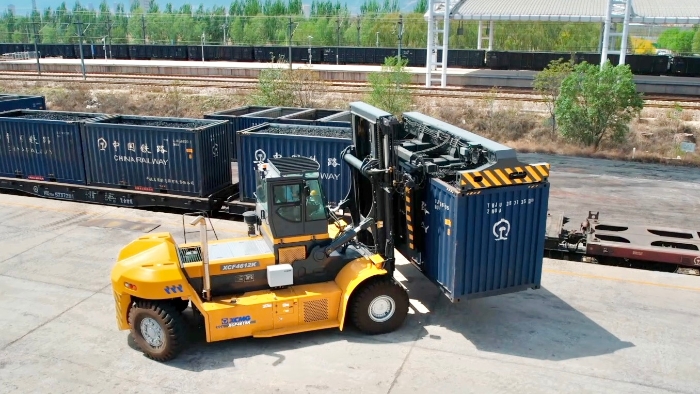 精准适配:核心装备XCF4612K铁路专用重箱正面吊,最大起重能力达38吨,可高效处理干散货箱、敞顶箱等主流箱型,全面满足货物运输需求。