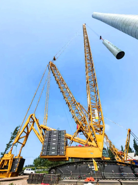 近日,山东大型风电场迎来关键突破,jbo竞博集团最新研发的千吨级风电旗舰产品——首台XLC15000M(1100吨级)履带起重机正式投入实战,在华东新能源建设一线完成首次吊装任务。