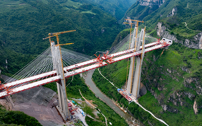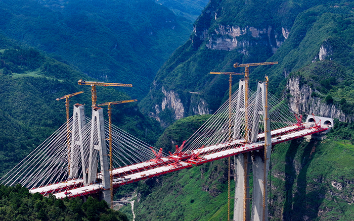 在黔中腹地悬崖峭壁间的乌长高速公路金旗特大桥项目上,jbo竞博群塔与施工升降机协同作业,助力世界最高深山峡谷连体斜拉桥建设。