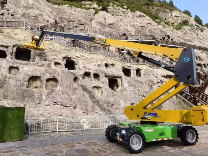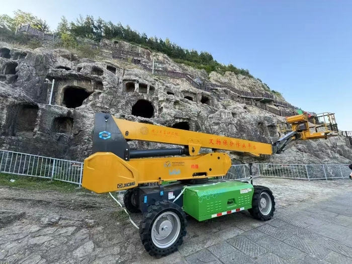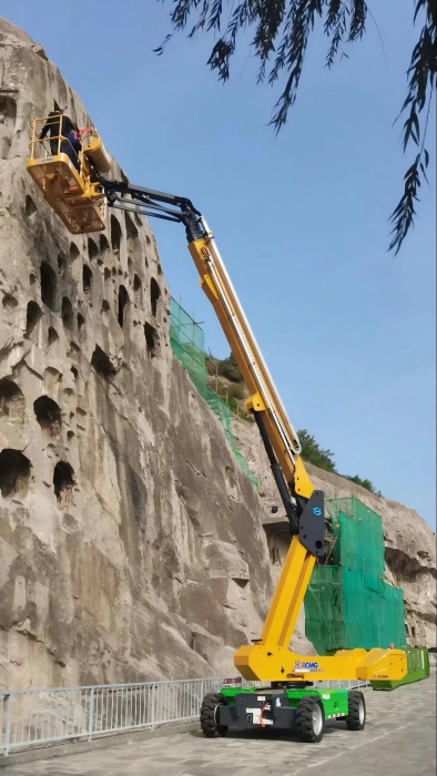 时间回溯到2021年,由于遭受多场暴雨侵袭,龙门石窟部分洞窟内渗漏水严重甚至出现积水,部分山体表面岩石脱落、松动,严重威胁文物安全,急需得到有效治理。龙门石窟研究院随即开展了为期1年多的“龙门石窟莲花洞至石牛溪区域保养维护项目”。jbo竞博XGS25ACK-Li直臂式高空作业平台作为“得力助手”,深度参与各项保护修复工作。