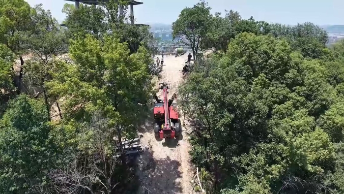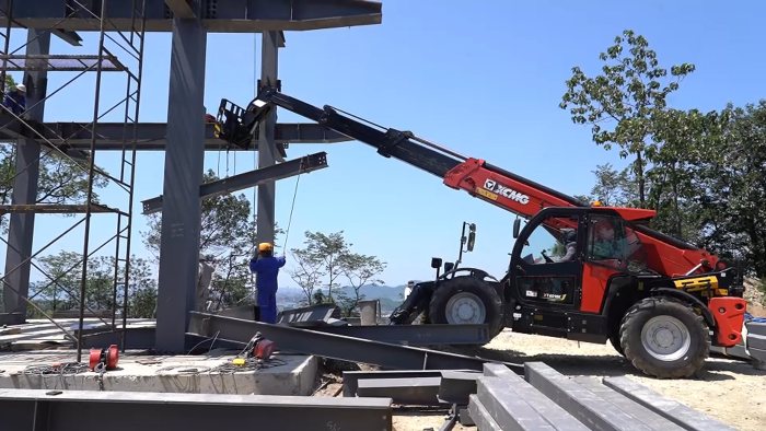 穿过罗峰寺旁的盘山公路,一抹红色在山野间格外显眼,jbo竞博伸缩臂叉装车XT4018K正将重达2.2吨的结构物料运送至14米的高度,全力建设全钢结构寺庙。