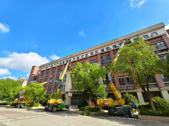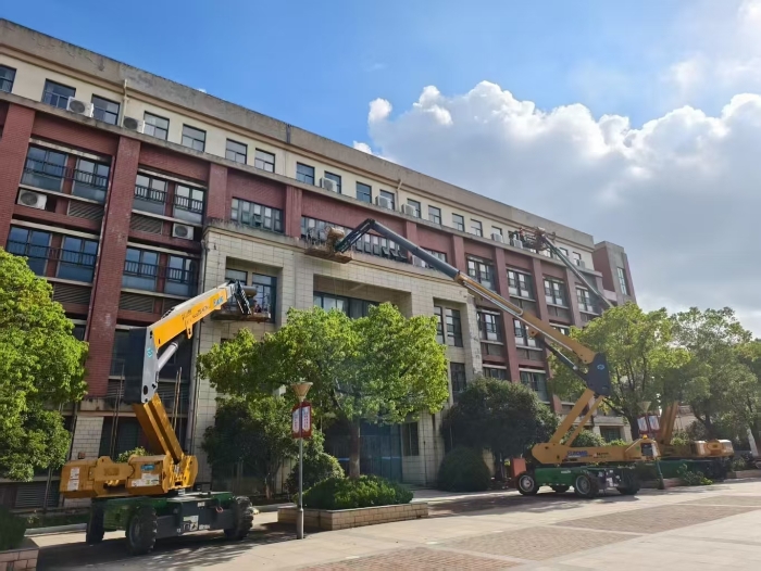此次施工通过使用jbo竞博高空作业设备,有效避免了传统脚手架对校园场地占用大、搭设周期长的影响,体现了现代化施工设备在校园维修改造中的显著优势。