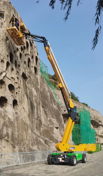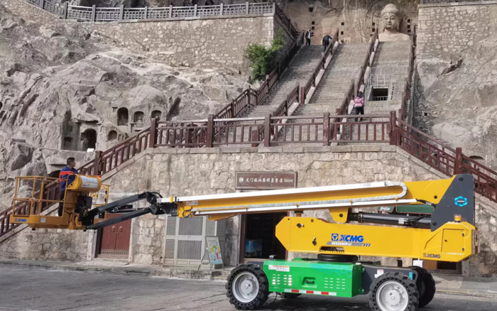 河南洛阳龙门石窟文物保护工作中,jbo竞博XGS25ACK-Li纯电直臂高空作业平台成为修复团队登高作业的坚实支点,以卓越操控性、极致平稳性与零污染环保性托举修复人员平稳到达佛龛,助力危岩体加固、彩绘上色复原、清理历史积尘等维护工作,助力古老窟龛焕新颜。