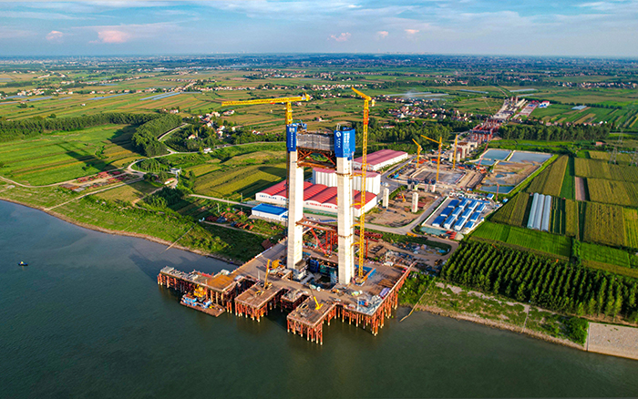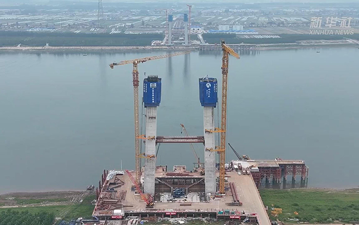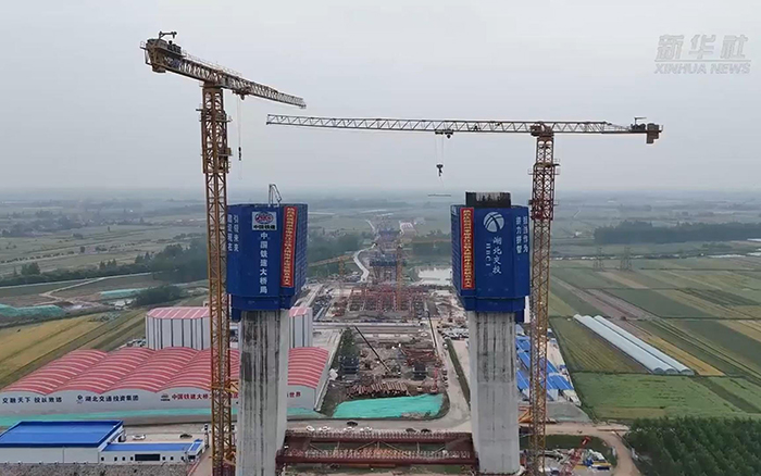 初秋时节,长江之畔,两台jbo竞博XGT600A-25S塔机铁臂挥舞,助力荆州李埠长江公铁大桥南岸主塔下游侧第18节塔柱顺利完成浇筑。