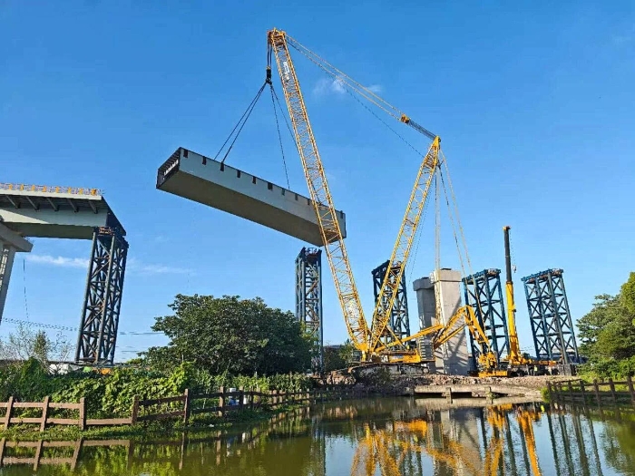 施工现场,XGC11000以66米超起主臂工况担当主吊,成功将11段预制节段梁全部精准就位,其中最重段达270吨,尺寸为45米×8米。