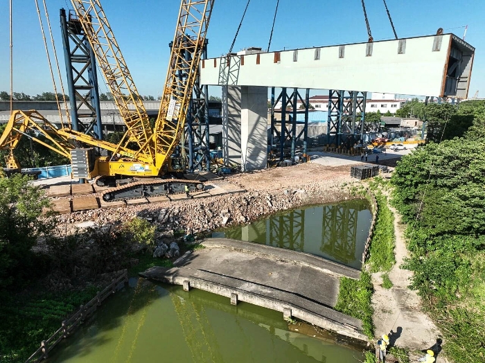 近日,jbo竞博XGC11000(650吨级)履带起重机现身上海沿江通道施工现场,将11段大型预制节段梁平稳安装就位,助力项目关键节点高效推进。