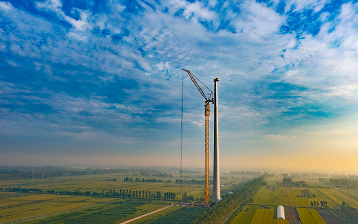 郯城风场此次吊装的风机创下区域高度纪录,采用140米混塔+45 米钢塔结构,叶轮直径达 220 米,仅机舱与叶轮总重就超 200 吨。185 米的高空作业,风力扰动、部件对接精度等因素对吊装设备的性能提出了极致考验,毫厘之差便可能影响整座风场的并网进度。
