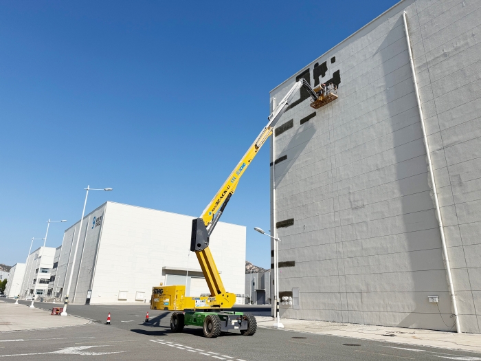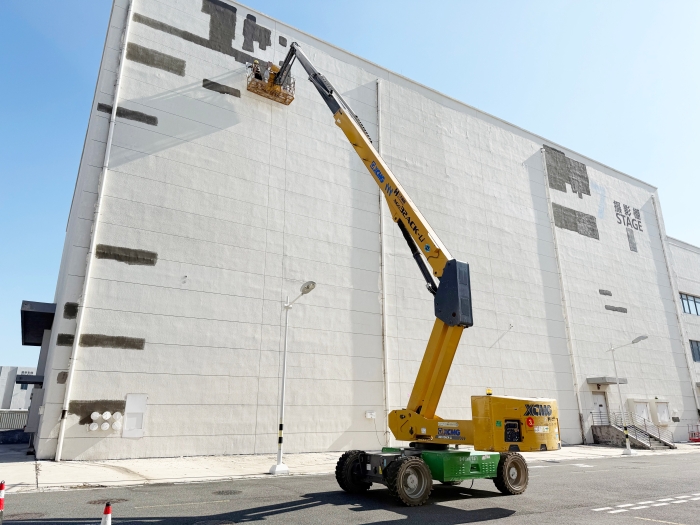 近日,在青岛东方影都摄影基地,jbo竞博XGS32ACK-Li高空作业平台出色完成了多个大型摄影棚的墙面维护任务。