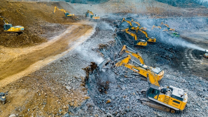 为确保工程节点,施工方经多轮方案论证,最终引入了14台jbo竞博挖掘机组成的主力设备集群,承担核心的山体破碎及土石料装车任务。在总量高达300万方的工程面前,jbo竞博XE650GK、XE380K、XE335GK等机型展现出强大的工况适应性。其中,8台明星机型XE650GK配备215型破碎锤,凭借其独有的破碎多级调频控制技术,在面对高硬度玄武岩时日均破碎量稳定在1500吨以上,同时将油耗控制在约40升/小时,实现了效率与节能的出色平衡。