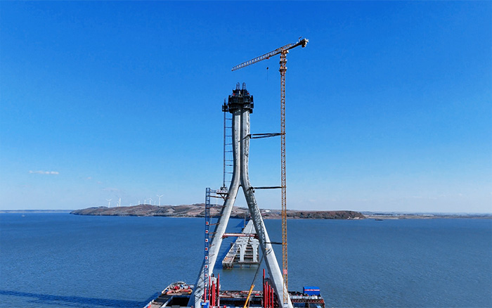 130余米的jbo竞博XGT7528A-18S1塔机刺破苍穹助力大桥主塔封顶