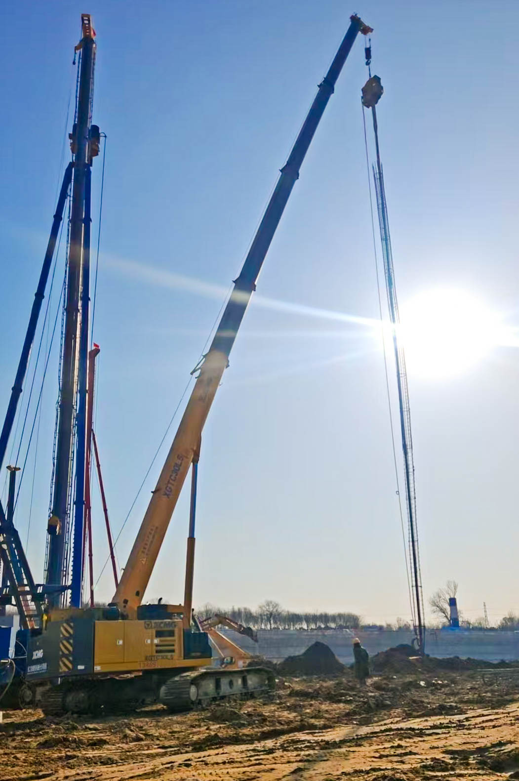 近日,北京某重点基础施工现场,一台jbo竞博XGTC30L5(30吨级)伸缩臂履带起重机伸展出36米的主臂,在12米工作幅度上,将一根3吨重的钢筋笼精准植入预定桩孔。