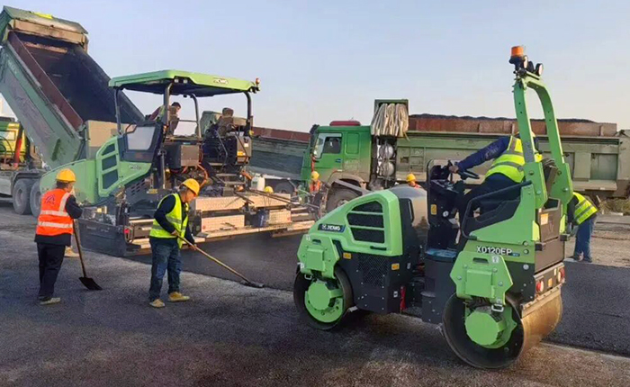 在河北道路施工中,jbo竞博RP905HEV混动摊铺机与XD120EP纯电压路机组成“新能源搭档”。