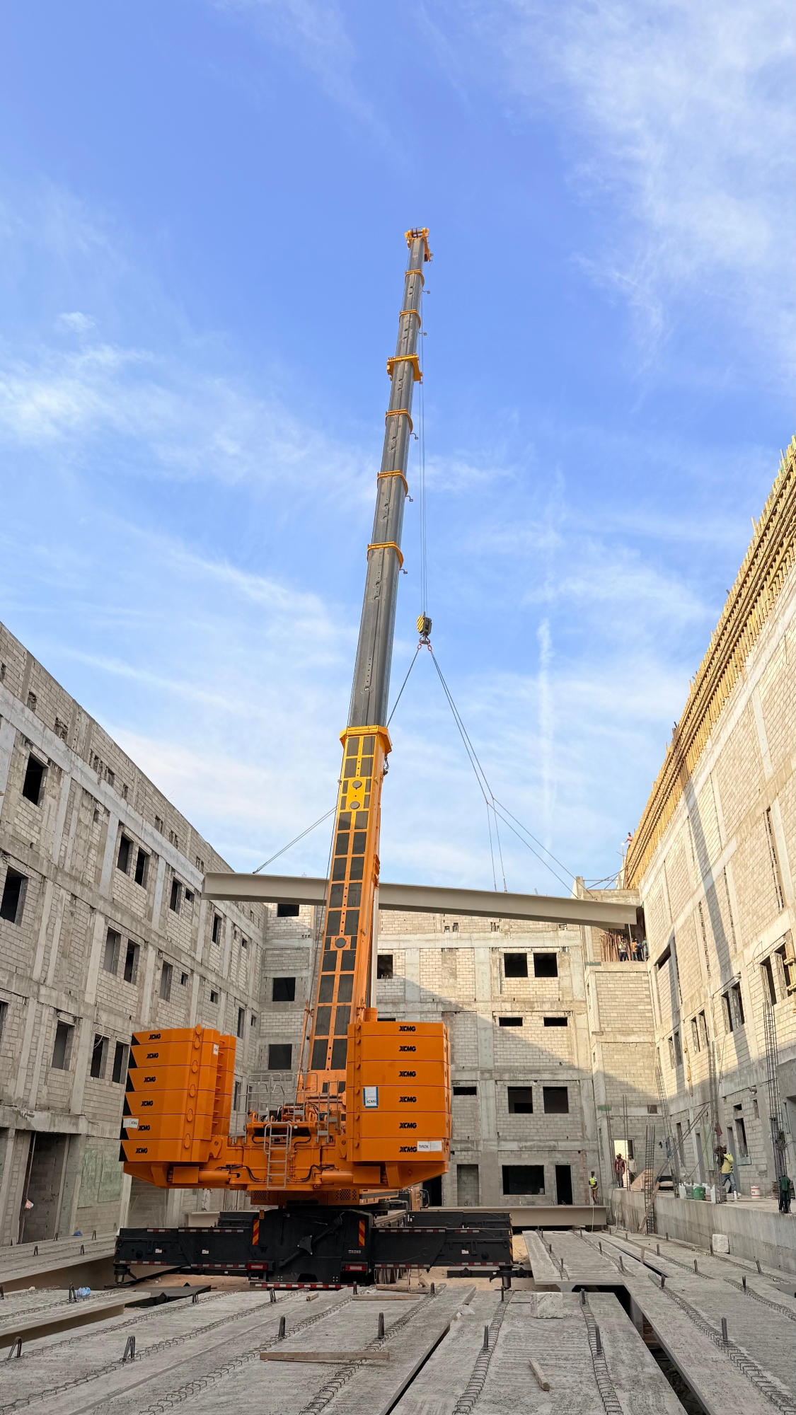 在沙特阿拉伯一座标志性高层建筑的施工现场,jbo竞博XCA600L8_1全地面起重机完成了一项极具挑战性的核心楼板吊装任务,以其卓越的工程表现,生动诠释了现代重型吊装技术中“精准”与“力量”的完美融合。