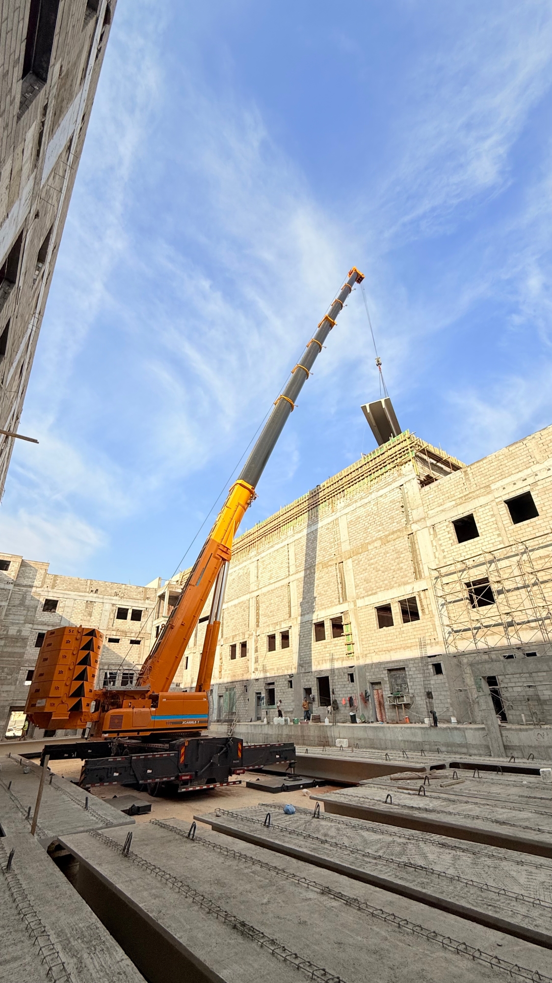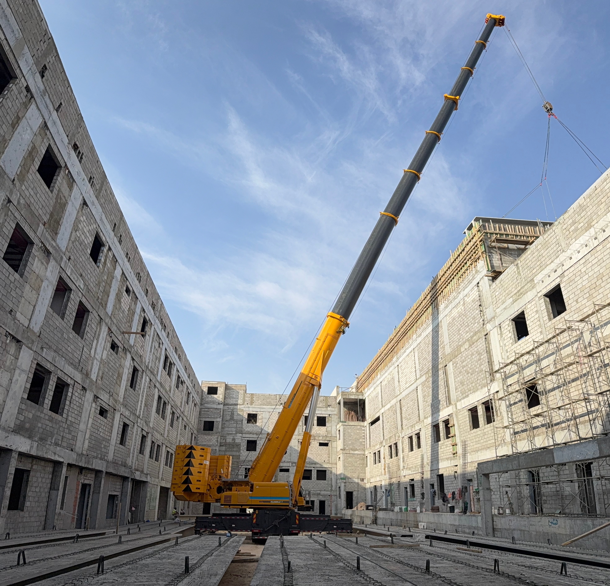 此次施工位于沙特快速发展的都市区域,项目本身对工期与精度有着严苛要求。高层建筑的楼板吊装,尤其是对于重量超过十吨的大型预制构件,不仅是对起重机极限载荷能力的考验,更涉及在复杂城市空间中的微动操作、抗风稳定及高空精准就位等一系列高技术要求。现场空间有限,周边环境复杂,对设备的机动性、站位适应性以及操控的精细度提出了全方位挑战。