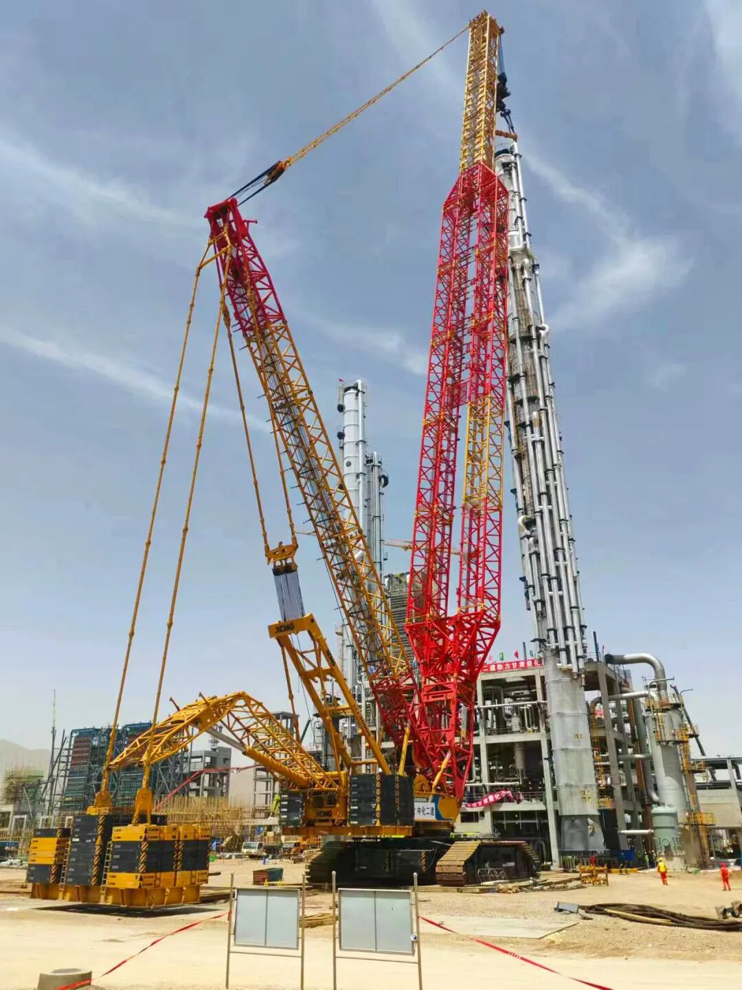近日,jbo竞博2000吨级履带起重机XLC30000在甘肃,强势助力当地某大型化工厂洗涤塔成功落座。