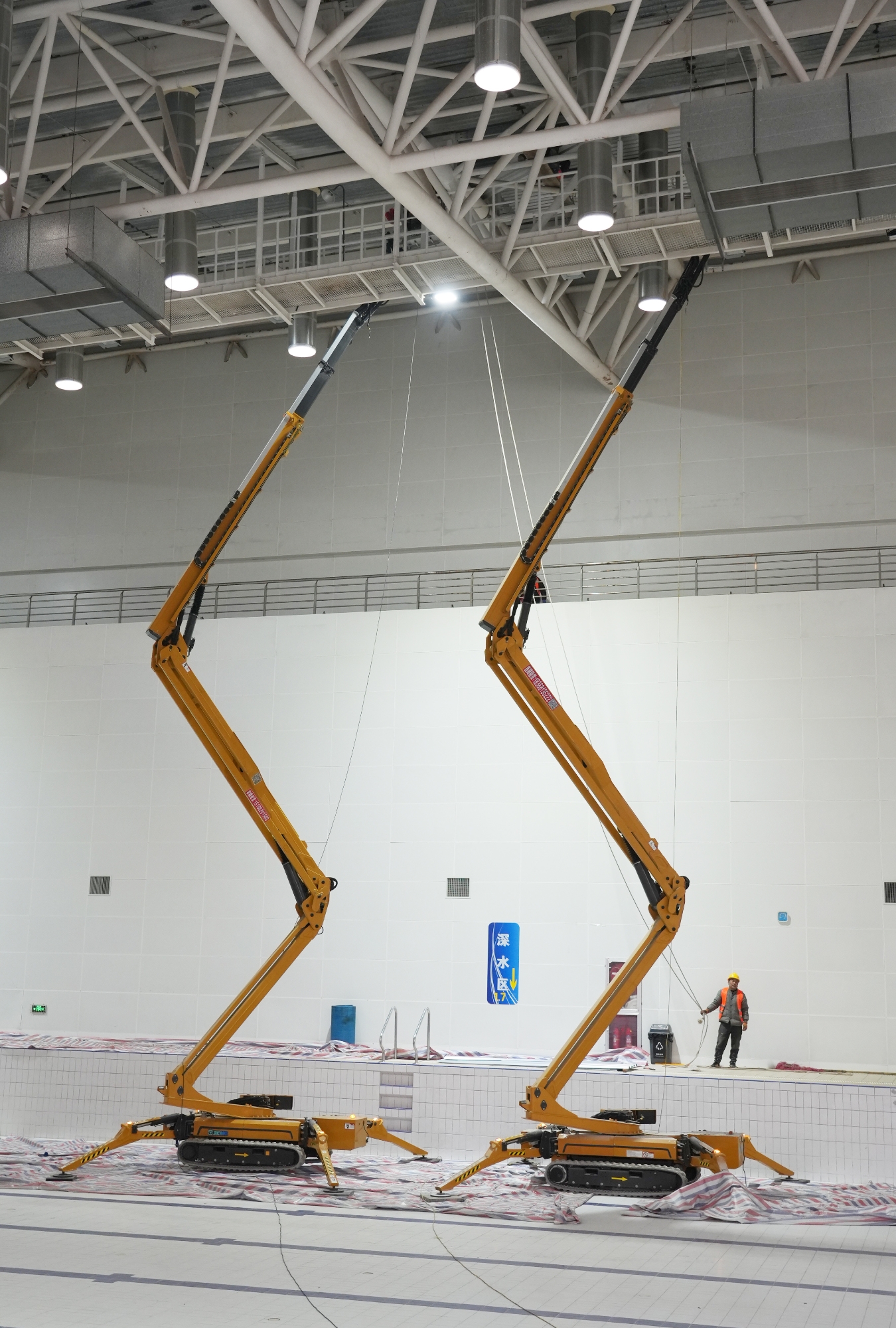 近日,3台jbo竞博XGA26X-Li蜘蛛曲臂高空作业平台在徐州奥体游泳馆有序展开施工,该项目主要涉及屋顶瓦片更换、除锈翻新等作业,施工面积约3200㎡,计划工期为一个月。