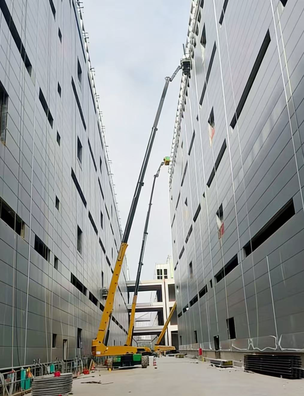 面对这场“高空攻坚战”,jbo竞博多台XGS58K与XGS52ACK-Li高米数直臂式高空作业平台组成“钢铁舰队”震撼登场。58米的极限作业高度轻松覆盖物流仓库外立面钢结构安装、幕墙铺设及机电系统施工的每一处高点;而搭载锂电池系统的XGS52ACK-Li则以零排放、低噪音的绿色优势,在密闭空间和夜间施工中游刃有余,实现了续航长、能耗省、环保达标的完美平衡。设备凭借灵活的臂架设计和精准的微动性能,在纵横交错的钢构之间自如伸展,助力建设者如同“搭积木”般高效完成高空作业。