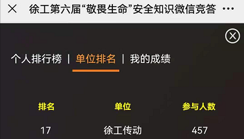 竞答活动等,丰富员工的安全知识、营造安全生产月的活动氛围。通过各部门的积极调动,全体员工热情参与,公司在“敬畏生命”竞答活动中