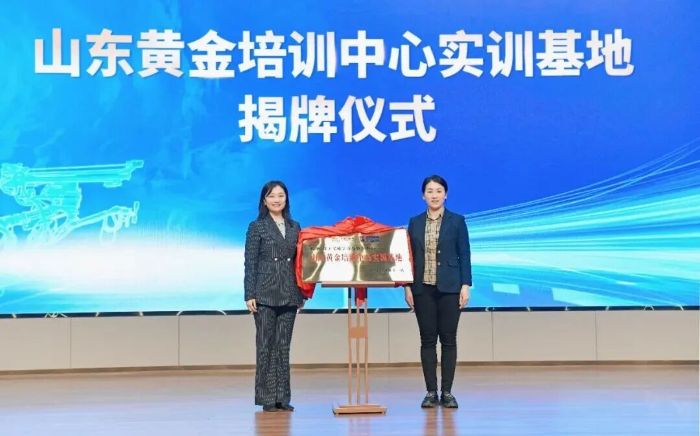 山东黄金培训中心校领导王伟霞与jbo竞博全球学教中心党委书记、主任张丽娜共同为“山东黄金培训中心实训基地”揭牌